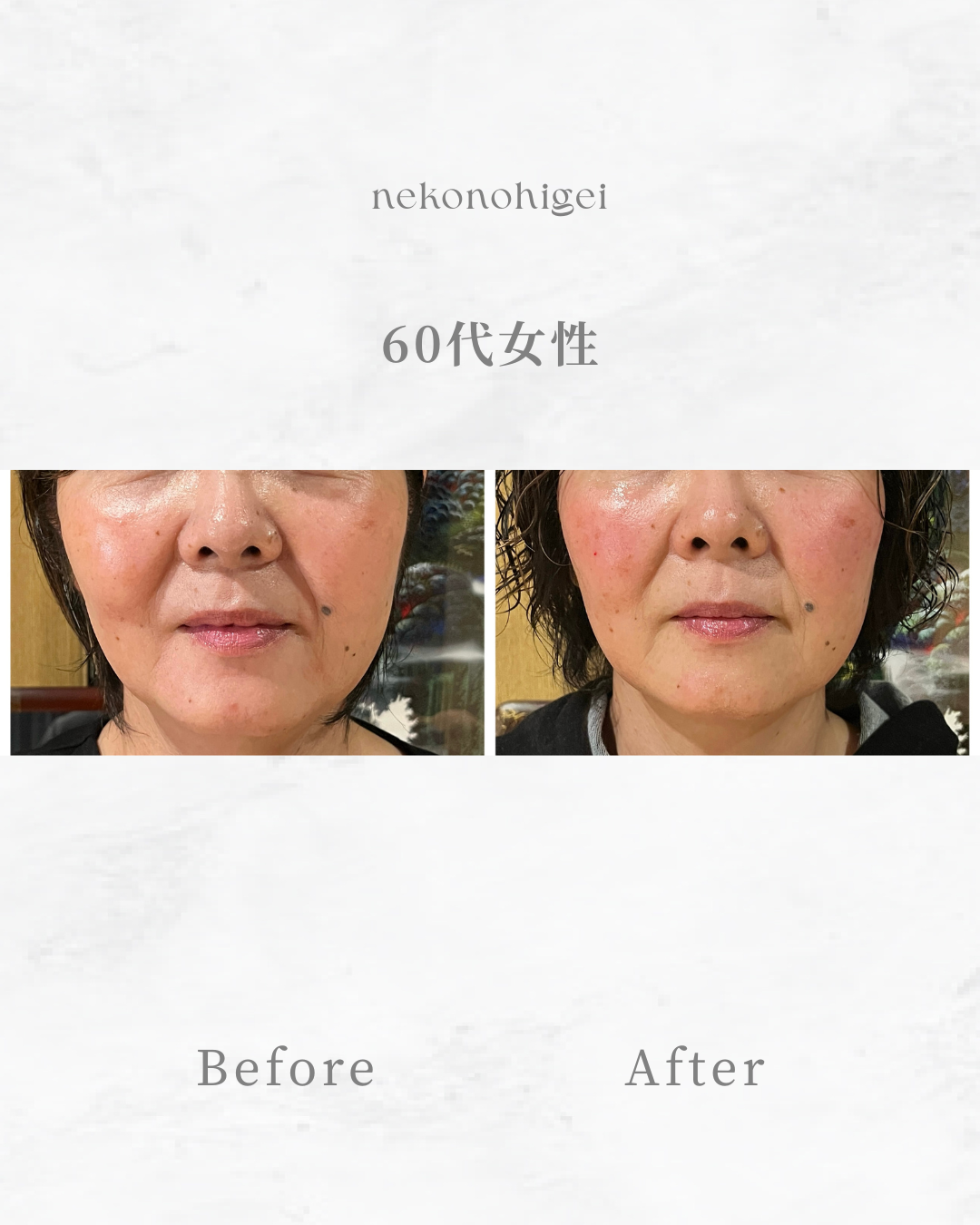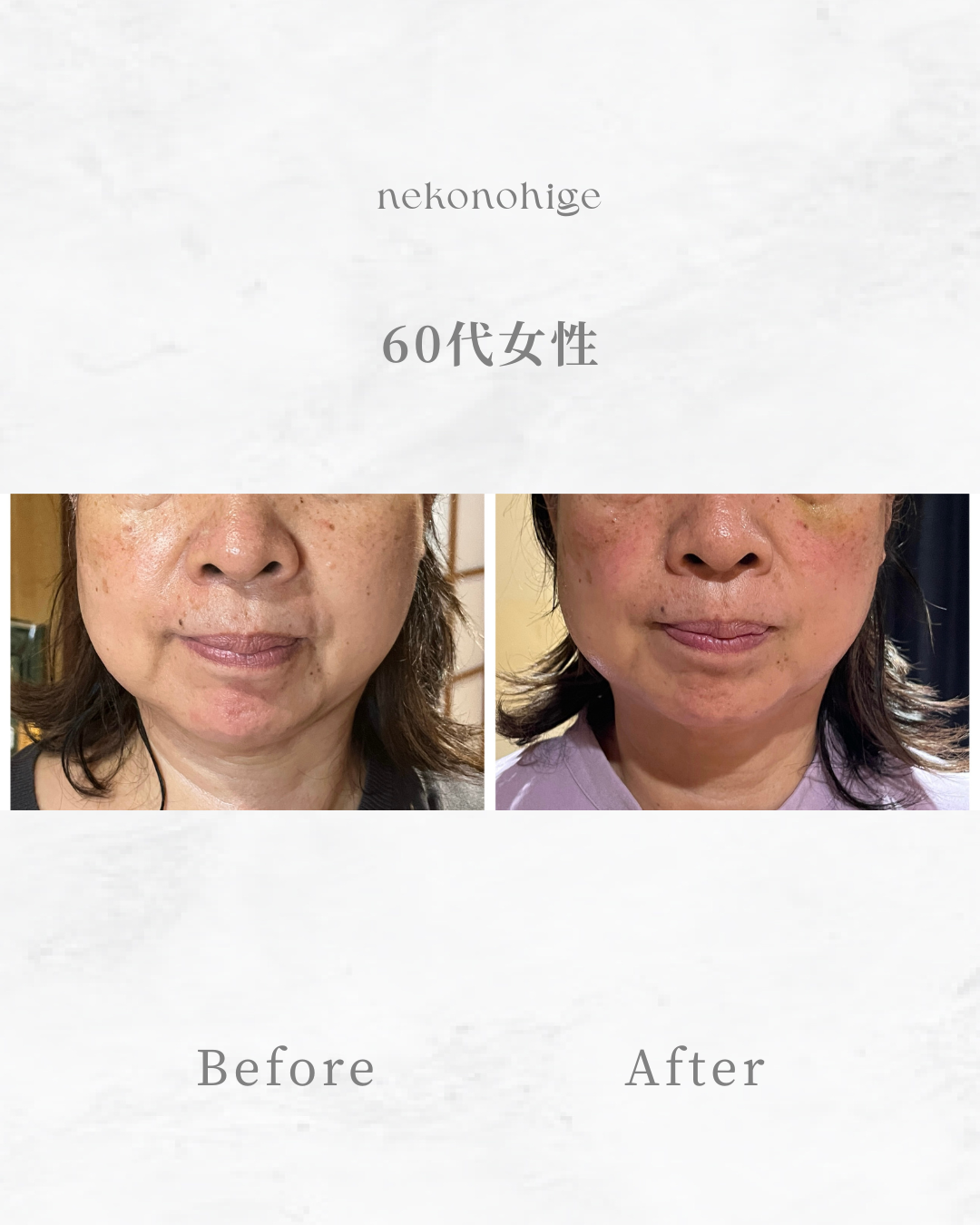 ねこのひげさんで施術を受けていくとだんだん身体が改善してくのが分かりました。顔のたるみも以前ほど気にならなくなってきたので、これからも継続して通います