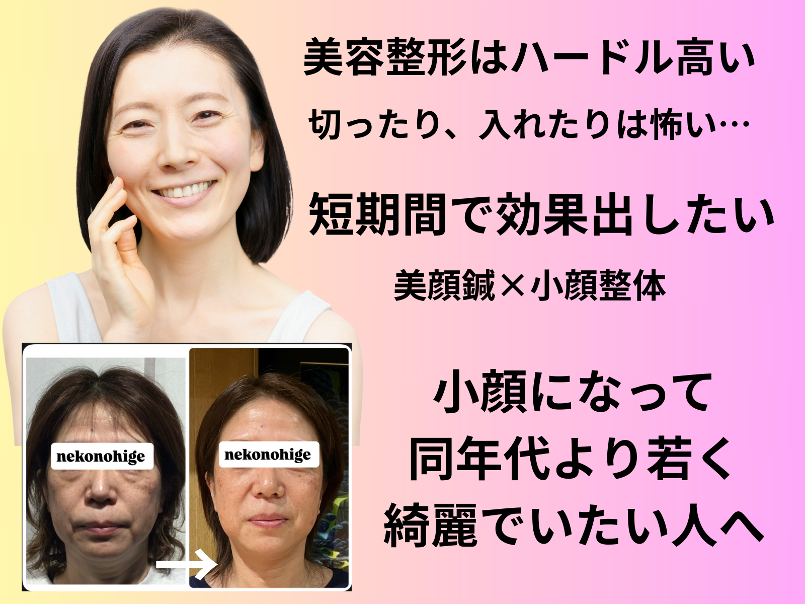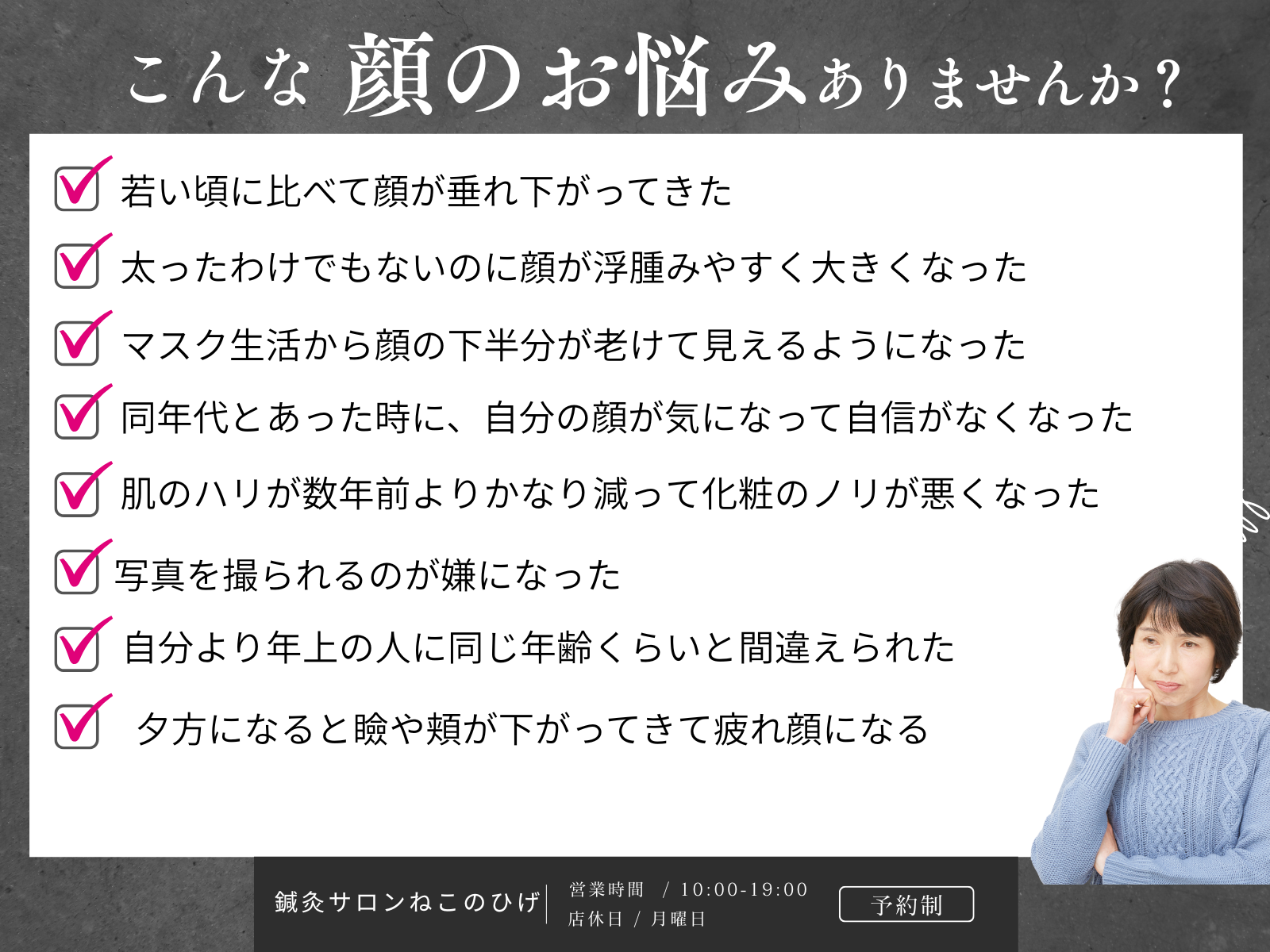 改善していけます!お顔のたるみ、ほうれい線は肩こりなども関係しているので、お身体のお悩みも一緒に改善していきます。